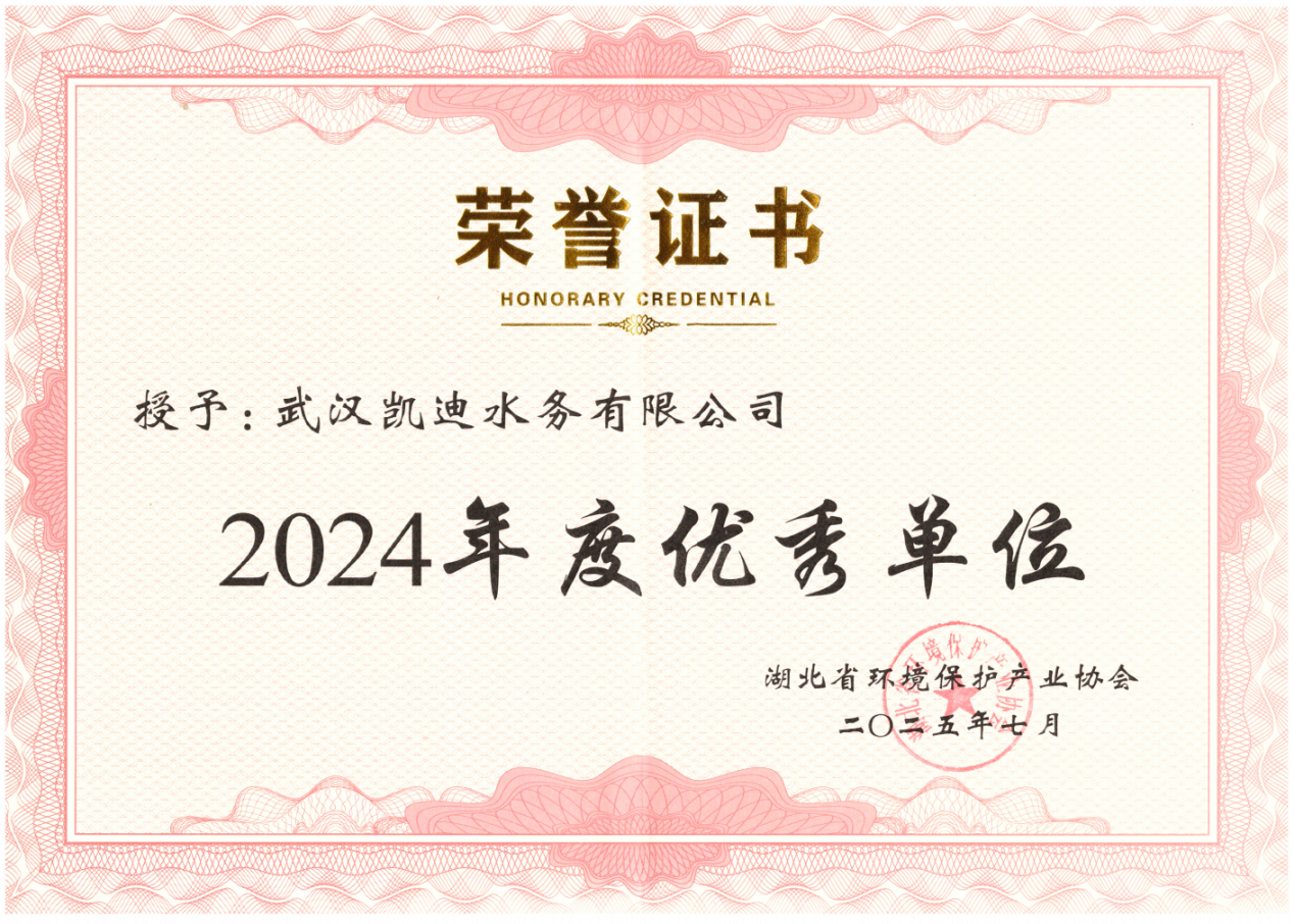 2025年7月29日,武漢凱迪水務有限公司獲得湖北省環境保護產業協會頒發的“2024年度優秀單位”榮譽證書,以表彰武漢凱迪水務有限公司在環境保護領域的突出表現。武漢凱迪水務有限公司將繼續秉持“正直、勤奮、創新、擔當”的理念,保持“求真務實、精益求精、以人為本、技術為先”的核心價值觀,為廣大客戶提供優質、專業的服務,以期實現“水質更清潔,生活更美好”的美好愿景。